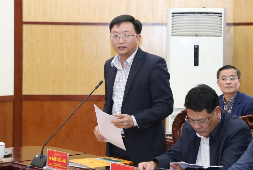 Chánh Văn phòng UBND tỉnh Nguyễn Thế Anh trình bày báo cáo tại buổi họp báo.