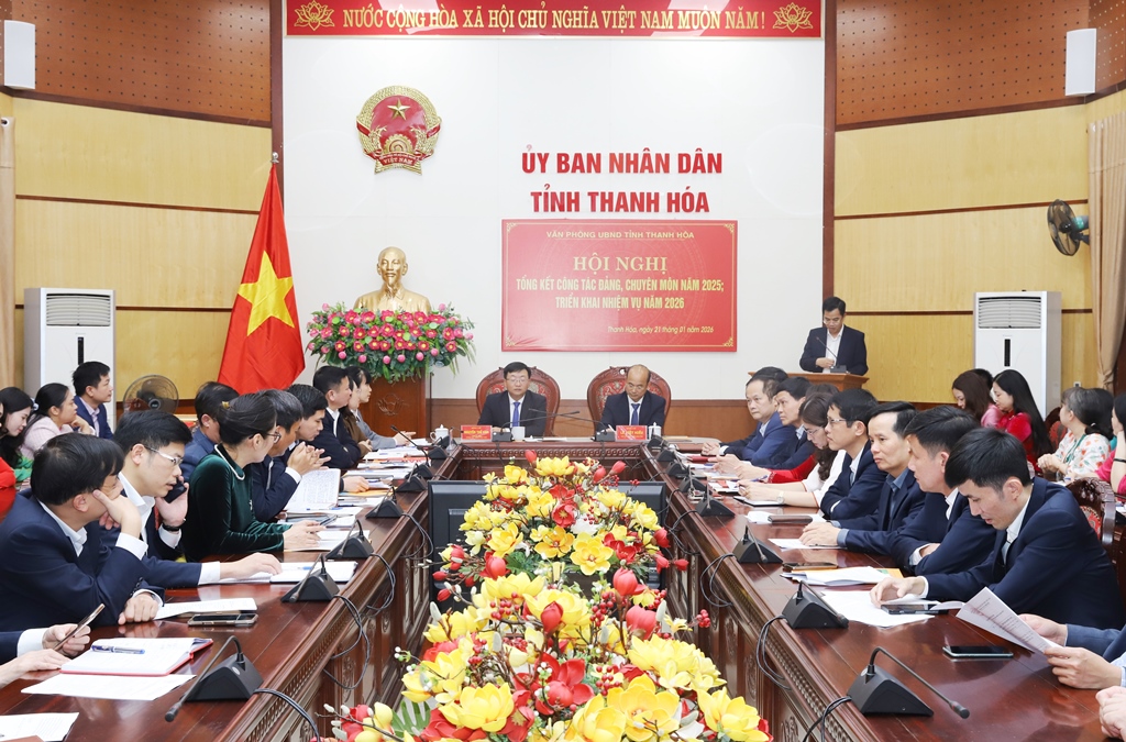 Chiều ngày 21/1/2026, Văn phòng UBND tỉnh đã tổng kết công tác năm 2025, triển khai nhiệm vụ năm 2026. Các đồng chí: Nguyễn Thế Anh, Tỉnh ủy viên, Chánh Văn phòng UBND tỉnh; Lê Việt Hiếu, Phó Chánh Văn phòng UBND tỉnh đồng chủ trì hội nghị.