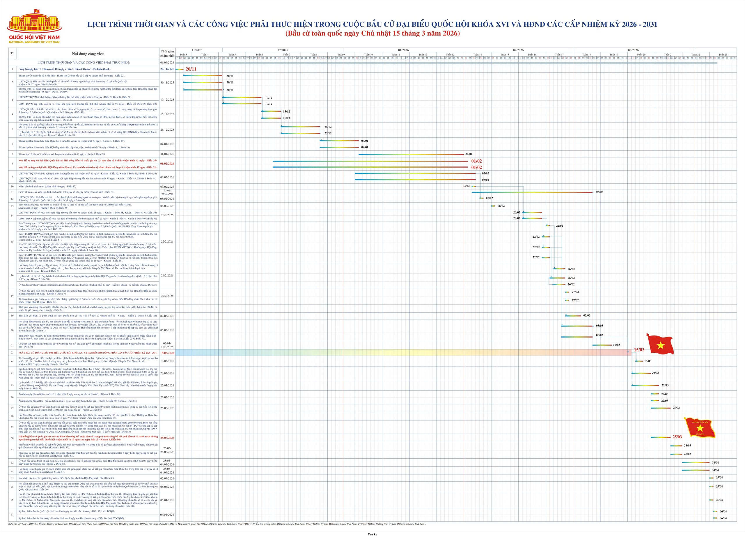 Lịch trình thời gian và các công việc phải thực hiện trong cuộc bầu cử Đại biểu quốc hội khóa XVI và HĐND các cấp nhiệm kỳ 2026-2031